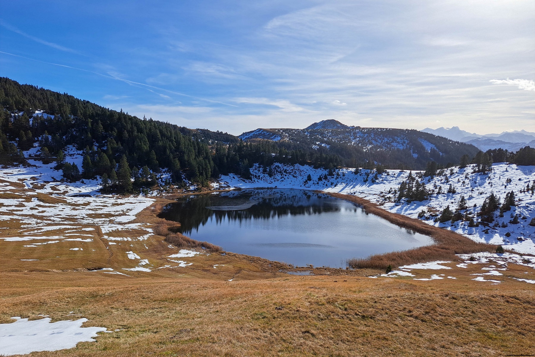 Depuis le sommet, il vaut la peine de descendre en direction de Seewenseeli (un beau pléonasme de toponyme). Pour ce faire, on descend l’arête sud jusqu’à un petit col depuis lequel on peut traverser vers le lac. Par de bonnes conditions, on peut encore monter au petit sommet dominant le col susmentionné. Là toutefois, nous avions opté pour la descente directe, car il y avait trop de neige dans les pentes nord-est.