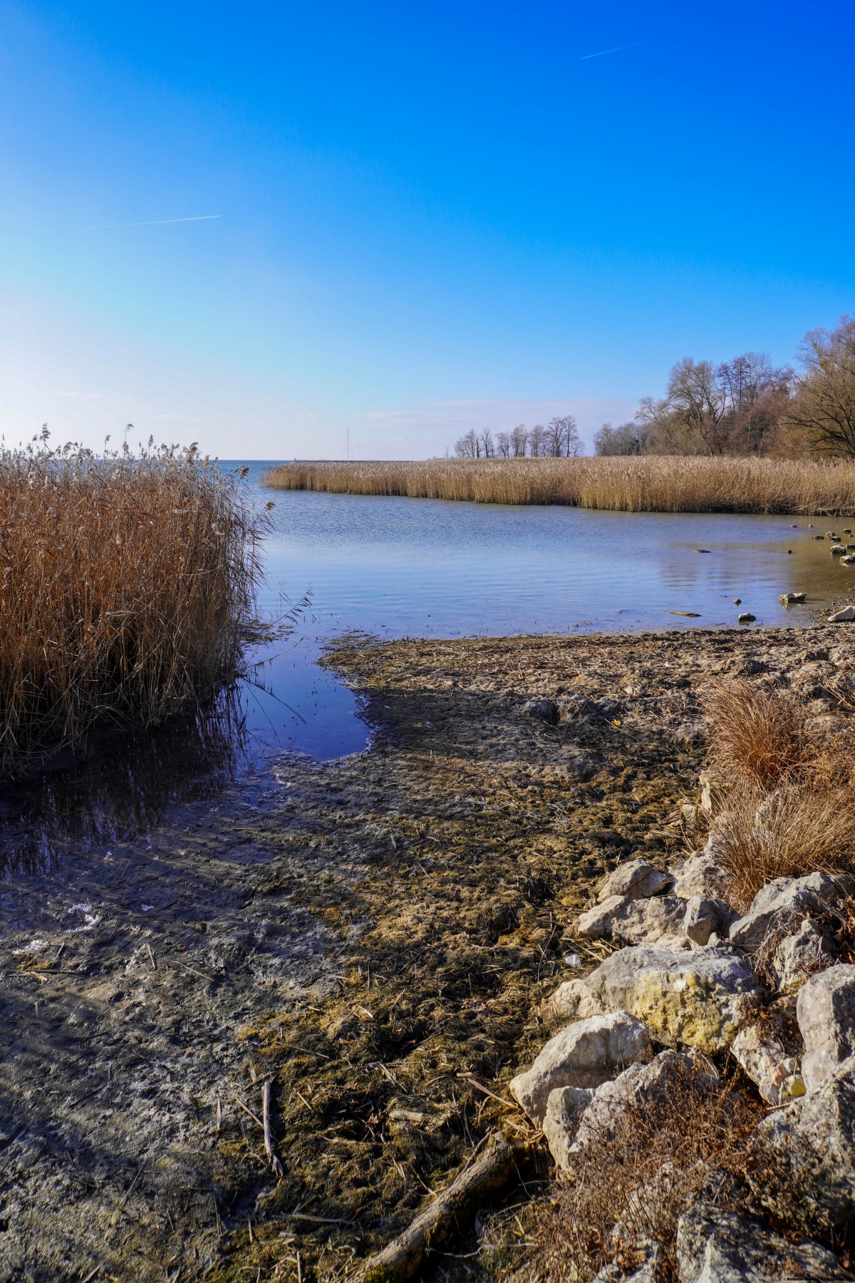Le long des rives du Lac de Neuchâtel existe un sentier permettant d’effectuer des randonnées sans dénivellation notable. Comme il y avait passablement de bise, nous nous étions dit qu’en perdant un peu d’altitude, nous pourrions bénéficier de quelques degrés de plus.
